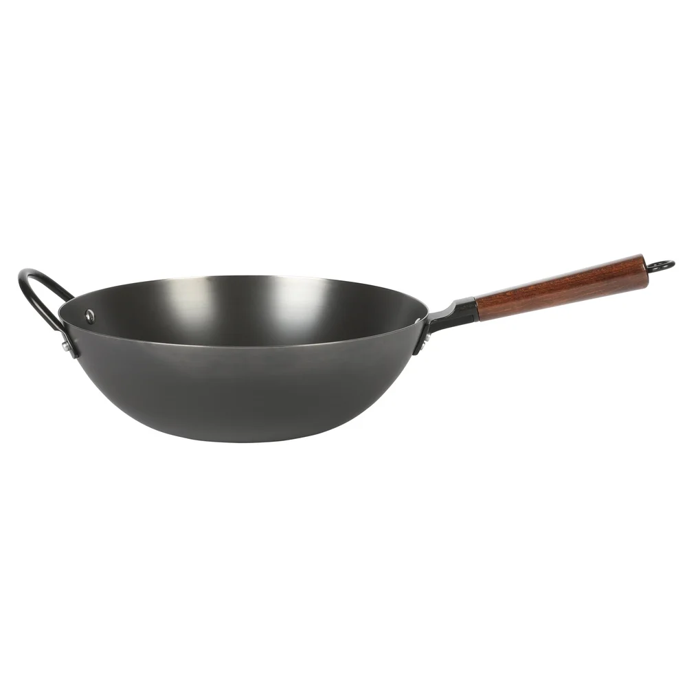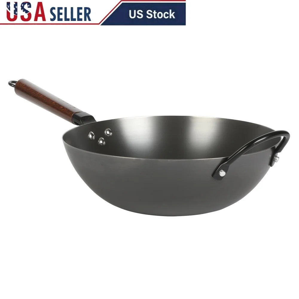 13 Inch Carbon Steel Wok Induction Safe Nonstick Heavy Gauge Kitchen Frying Pan Detachable Handle Rust Resistant Easy Cleanup